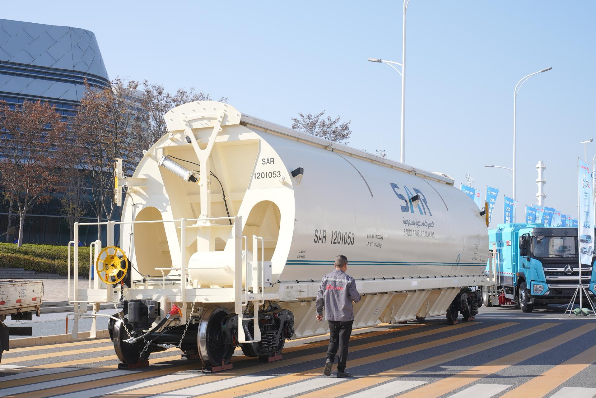 另外,还有各式各样新型的列车,不禁让人眼花缭乱。“这款专为沙特客户定制的磷酸盐漏斗车,最大承载量可达100吨。”展馆外,一节印有阿拉伯语字样的奶黄色车体,映入眼帘,这是中车株洲车辆有限公司带来的最新展品。