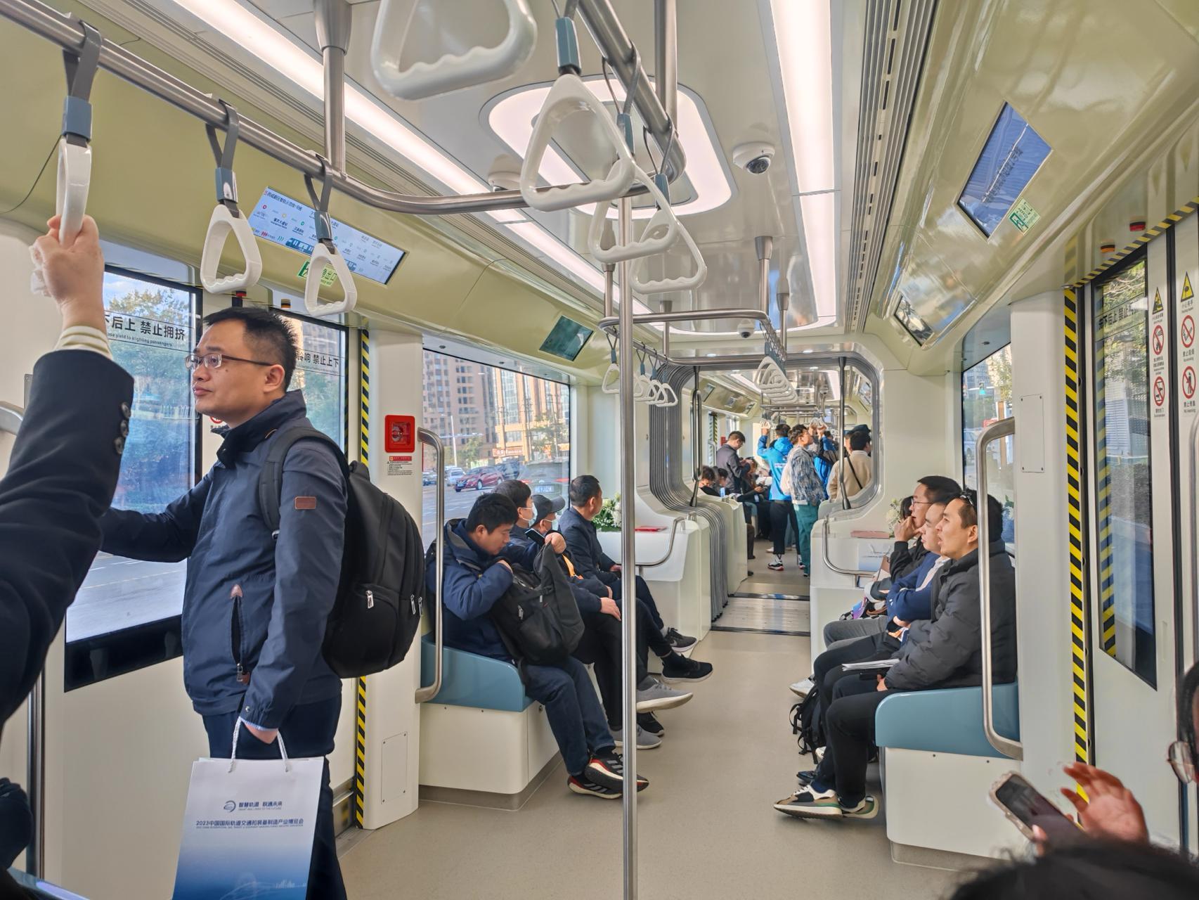 本届轨博会期间,智轨列车承担接送嘉宾的任务。这列智轨列车共有3节车厢,外观看起来像三列公交车首尾相连,但是比公交车车厢更宽敞。列车车身有着很大的观景窗,车内的空间也非常开阔,行驶起来非常平稳、安静。