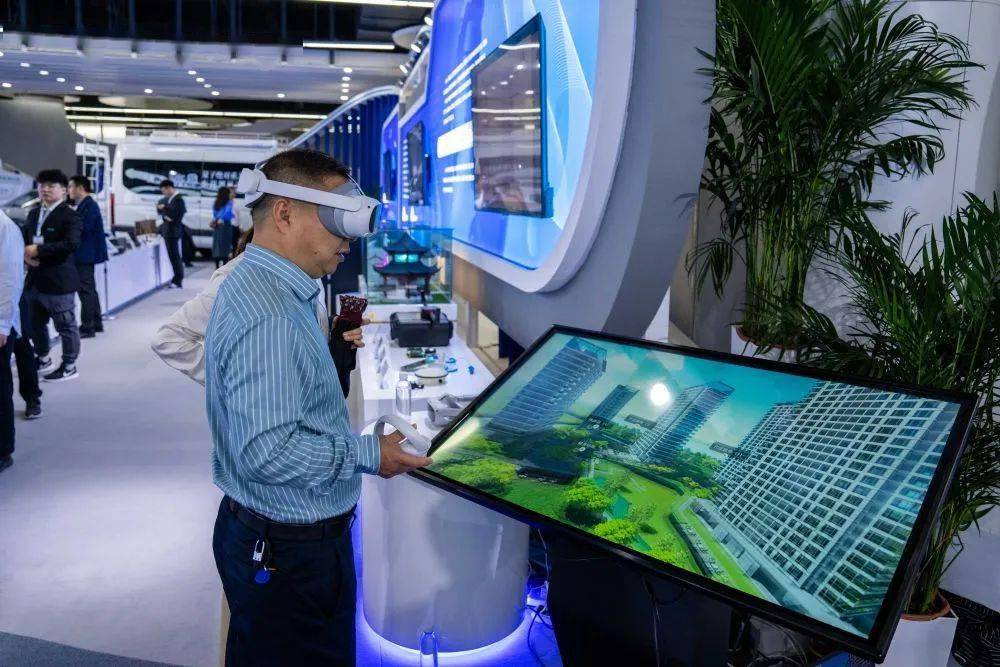 10月26日,在株洲国际会展中心,观众穿戴VR设备体验利用北斗技术辅助建模的地图仿真模型。摄影丨新华社记者 陈思汗