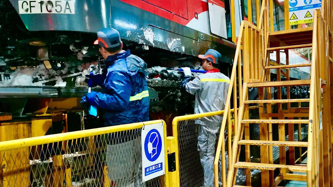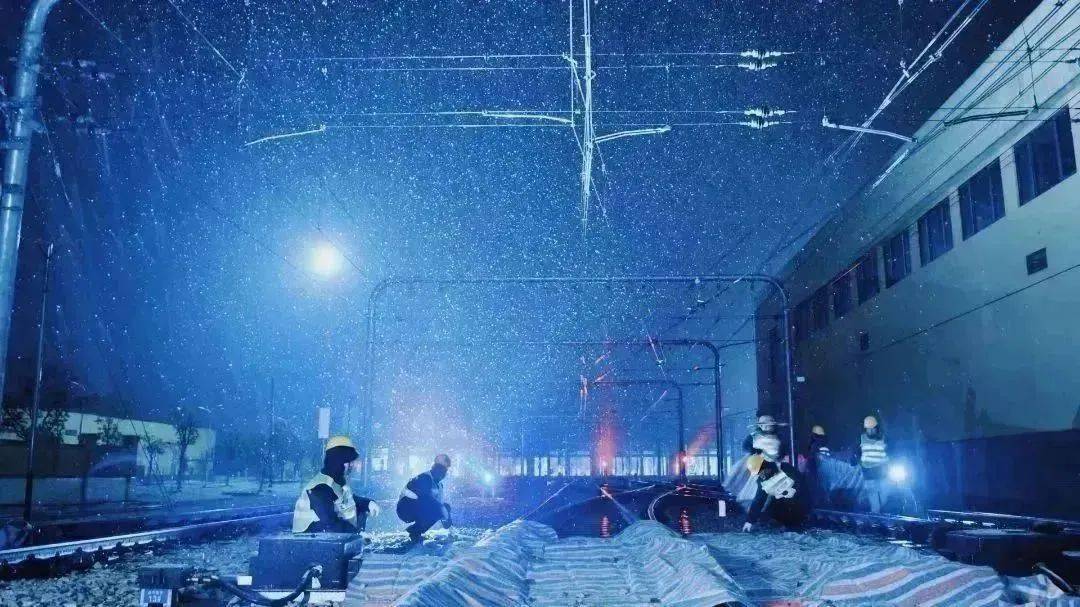 “同志们,风霜露重,大家精检细修的同时更要保护自身安全。”午夜刚过,数百名接触网、轨道、信号、车辆等专业安全交底前的叮嘱犹在耳畔。他们顶风冒雪,集中在露天区段线路上反复巡视,通宵监测接触网温度及表面覆冰情况,对各道岔转折部分、岔心轮缘槽部分、出入段线线路等重点区段积雪进行定时清理,对热滑地段以外的所有道岔进行雨布遮盖。