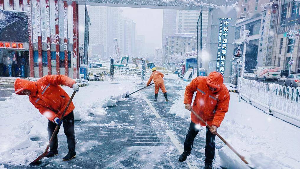 为确保周边群众安全出行,各建设项目大清早便组织工区党员、青年团员及班组人员火速集结,以 “铲雪除冰保安全,党员青年在行动”主题党团日活动为号召,对潇湘晨报、曲塘路、中心医院周边通道、青园路口、林科大、铁道学院、机场高速、芙蓉北路等进行铲雪除冰。暴雪中一抹抹移动的“雪里红”,一条条新开辟的“雪中路”,彰显着长沙轨道的社会担当,映照着轨道建设者的为民初心。