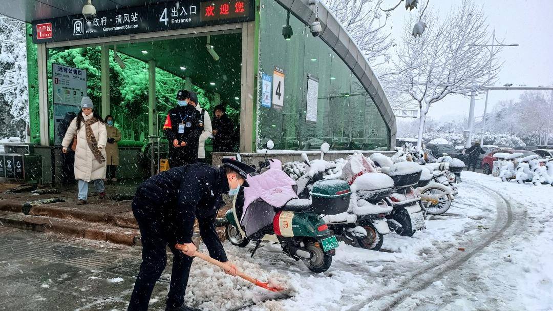 从21日晚到今早,全线各车站工作人员的忙碌一直没停,出入口铺洒工业盐,覆盖雨布,不间断巡视及清扫……凌晨5点,彻夜未眠的他们,又开始撤掉雨布、清扫出入口积雪,在出入口及高架站连廊铺设防滑垫,并安排专人值守各出入口,做好车站范围内的除冰扫雪、积水清除工作,确保客服质量和乘客出行安全。